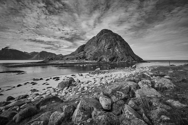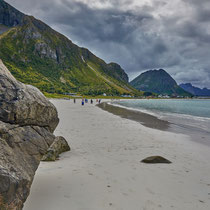 Nordnorwegen hat "karibisch" anmutende Strände mit weißem Sand und klarem, wenn auch eiskaltem Wasser, die oft als Highlights gelten. Die bekanntesten davon finden sich auf den Lofoten, darunter der Haukland Beach und der Kvalvika Beach, die sich durch ihre malerische Lage in Buchten vor steilen Berggipfeln auszeichnen.